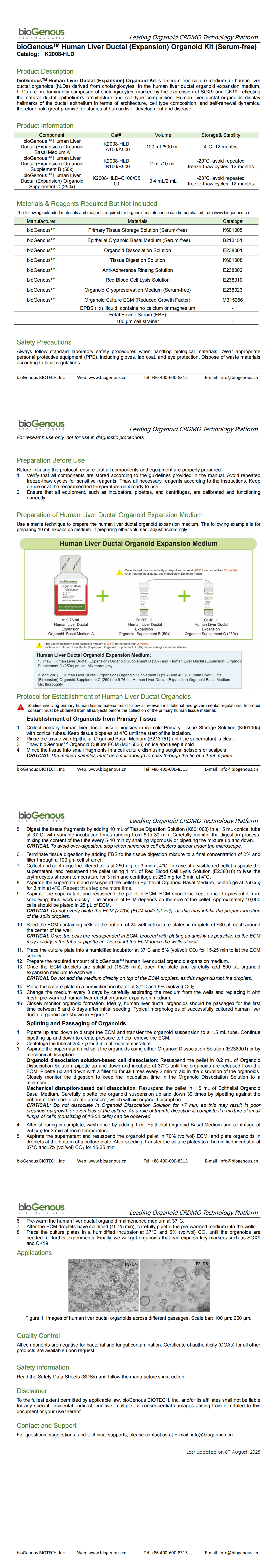bioGenousTM Human Liver Ductal Organoid Kit is a chemically defined cell culture medium for establishment and maintenance of human liver ductal organoids(hLDs) derived from introhepatic cholangiocyte. Self-renewal of the ductal epithelium is driven by the proliferation of stem cells and their progenitors located in liver. hLDs display all hallmarks of the ductal epithelium in terms of architecture, cell type composition, and self-renewal dynamics, therefore hold great promise for unprecedented studies of human liver development and disease, hLDs may also have applications in regenerative biology through ex vivo expansion of the ductal epithelium.