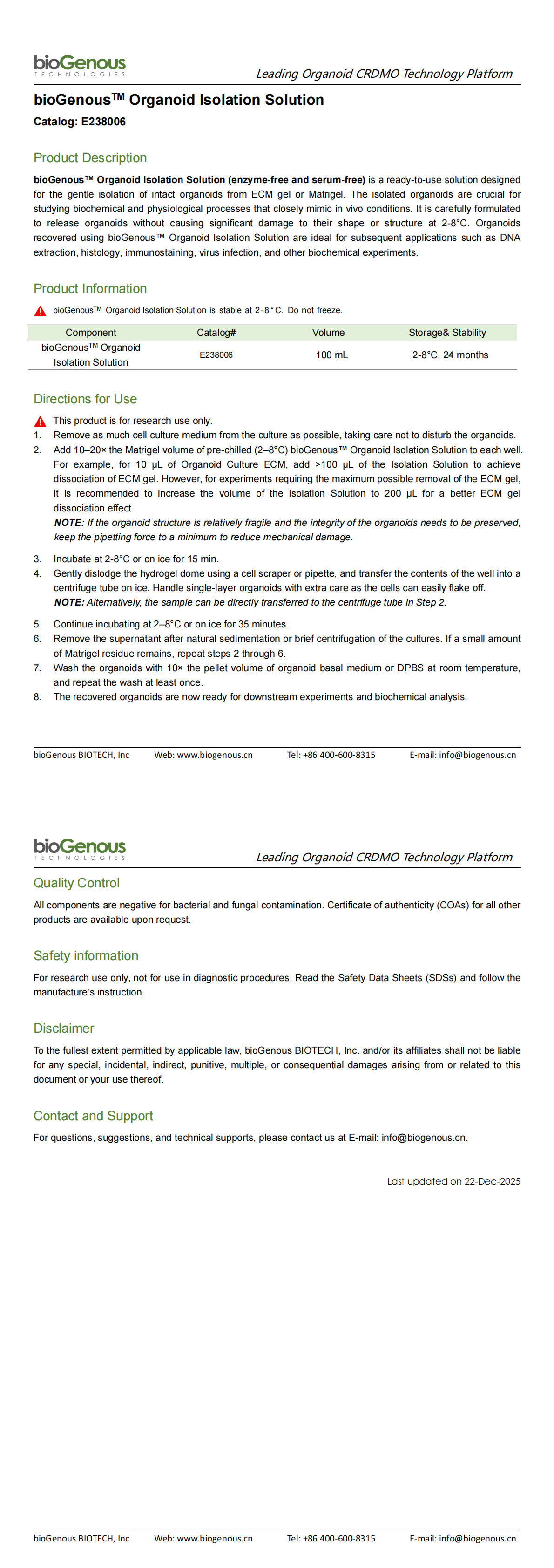 bioGenous™ Organoid Isolation Solution (enzyme-free and serum-free) is a ready-to-use solution designed for the gentle isolation of intact organoids from ECM gel or Matrigel; the isolated organoids are crucial for studying biochemical and physiological processes that closely mimic in vivo conditions, and it is carefully formulated to release organoids without causing significant damage to their shape or structure at 2-8°C, with organoids recovered using this solution being ideal for subsequent applications such as DNA extraction, histology, immunostaining, virus infection, and other biochemical experiments.