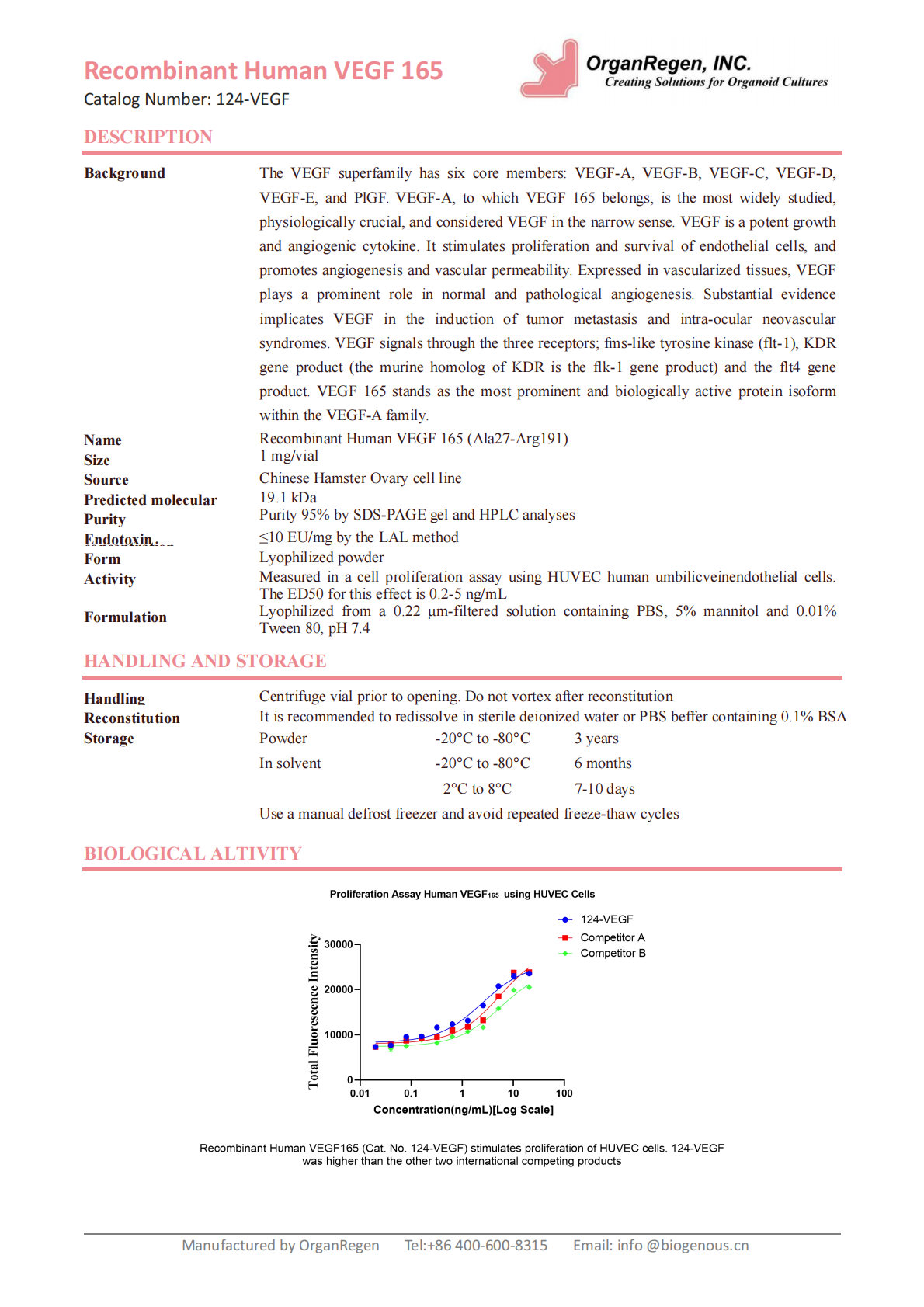 The VEGF superfamily has six core members: VEGF-A, VEGF-B, VEGF-C, VEGF-D, VEGF-E, and PlGF. VEGF-A, to which VEGF 165 belongs, is the most widely studied, physiologically crucial, and considered VEGF in the narrow sense. VEGF is a potent growth and angiogenic cytokine. It stimulates proliferation and survival of endothelial cells, and promotes angiogenesis and vascular permeability. Expressed in vascularized tissues, VEGF plays a prominent role in normal and pathological angiogenesis. Substantial evidence implicates VEGF in the induction of tumor metastasis and intra-ocular neovascular syndromes. VEGF signals through the three receptors; fms-like tyrosine kinase (flt-1), KDR gene product (the murine homolog of KDR is the flk-1 gene product) and the flt4 gene product. VEGF 165 stands as the most prominent and biologically active protein isoform within the VEGF-A family.