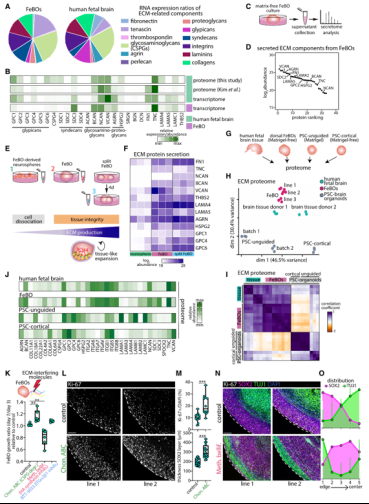 Increasing evidence indicates that the extracellular matrix (ECM) and ECM-cell interactions play a crucial role in regulating human brain development. At the transcriptomic level, researchers observed high similarity between FeBOs and human brain tissue development. Further comparison with proteomic data revealed good similarity in transcriptomic-proteomic expression for key ECM brain components such as proteoglycans, glucans, and laminarins. They also investigated functional ECM secretion through mass spectrometry analysis of FeBO supernatant, detecting various secreted ECM components—including those specifically enriched in human fetal brain tissue.