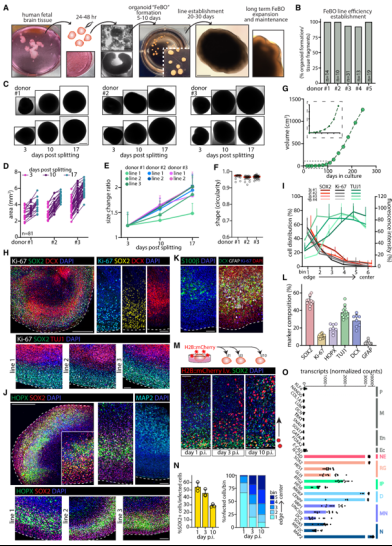 Next, the researchers assessed FeBOs' cellular composition using a panel of common neurodevelopmental markers. Results revealed abundant neural stem/progenitor cells (SOX2+) at FeBOs' periphery, while neuronal cells (TUJ1+, DCX+, NeuN+) resided centrally. Quantitative analysis of cell composition revealed regenerative abundance across distinct cell populations, highlighting cellular heterogeneity within FeBOs. They further assessed cell lineage dynamics via lentiviral infection of intact FeBOs, finding that labeled cell numbers increased over time and were also located within neuron-rich regions of the organoid, supporting ongoing neurogenesis. Transcriptomic profiling also demonstrated their unique neural ectodermal characteristics.