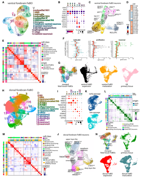 To investigate the cellular heterogeneity of FeBOs in greater detail, researchers performed single-cell sequencing on cells derived from FeBOs. Through subpopulation clustering analysis, they defined the heterogeneity of neurogenic and neuronal populations, identifying distinct types of intermediate neuronal precursors. Simultaneously, they found that FeBOs cells integrated well with human fetal brain tissue cells, suggesting similarities between the two. Furthermore, they compared the similarity between early-stage (2-month) and late-stage (6-month) FeBOs, finding that cells integrated well in the same dimensionality reduction space. Correlation analysis showed high relatedness among most cell subpopulations. These features highlight the cellular heterogeneity exhibited by FeBOs and their high similarity to primary cell types.