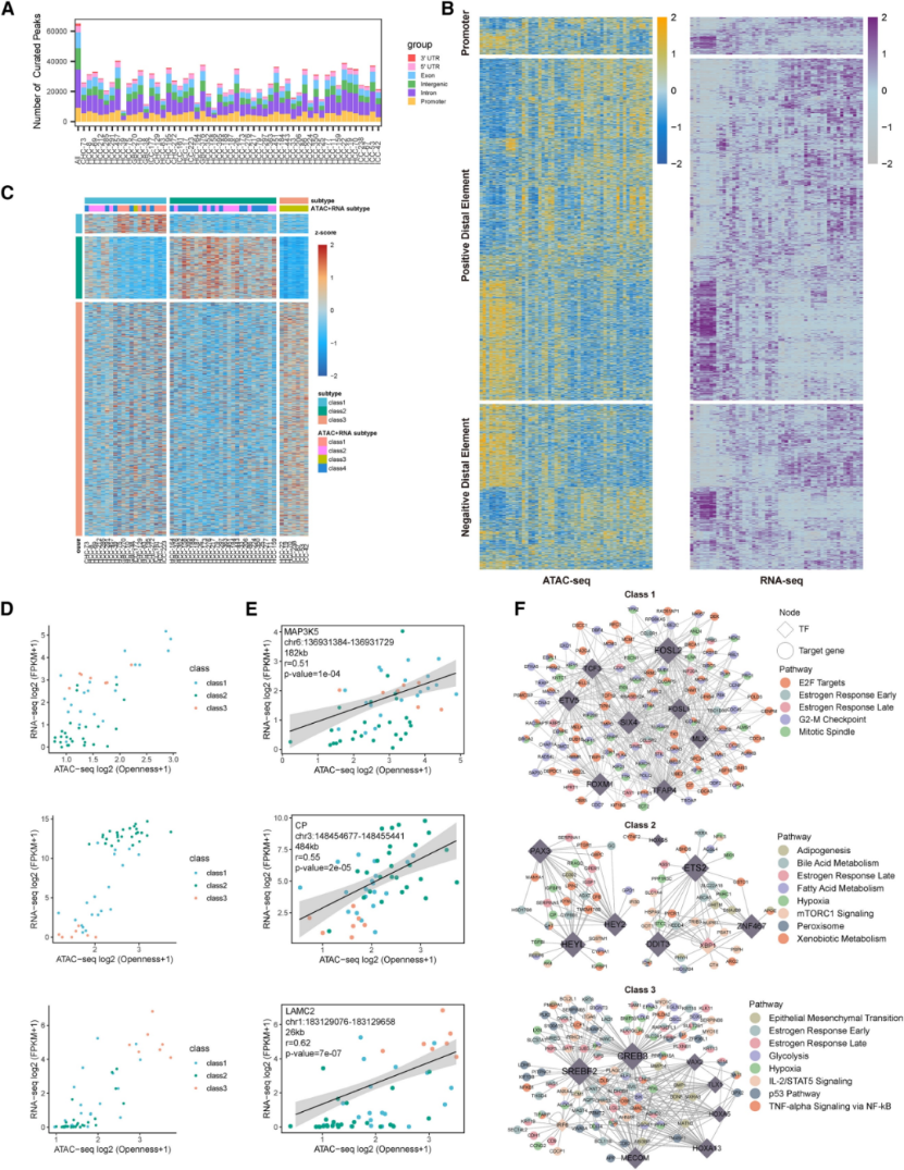To investigate transcriptional regulatory networks in hepatobiliary tumors, researchers performed genome-wide chromatin accessibility analysis via ATAC-seq in the PDHO model. Most ATAC-seq peaks mapped to distal intergenic and intronic regions, with no significant differences in peak numbers across the three subtypes (Figure 3A). To further characterize biological features, researchers integrated ATAC-seq data with RNA-seq data, performing Pearson correlation analyses between gene expression and chromatin accessibility at DNA regulatory elements. By examining ATAC-seq accessibility profiles based on RNA classification, 4,266 subgroup-specific peaks were identified (Figure 3C). Distant elements exhibited greater specificity and a broader dynamic range of activity associated with gene expression, while promoter elements showed lower accessibility. Both element types displayed correlation patterns similar to global gene expression. Although these peak-to-gene links across subgroups were driven by similar regulatory regions, most were strongly driven by a single cluster (Figure 3D). Additionally, the researchers analyzed and identified 24 transcription factors (TFs) promoting each subgroup (Figure 3F). Core transcription regulatory network (TRN) analysis accurately reproduced known subgroup-specific regulators: FOXM1 and FOSL1 in subgroup 1; DDIT3, XBP1, and ZNF467 in subgroup 2; and HOXA in subgroup 3.