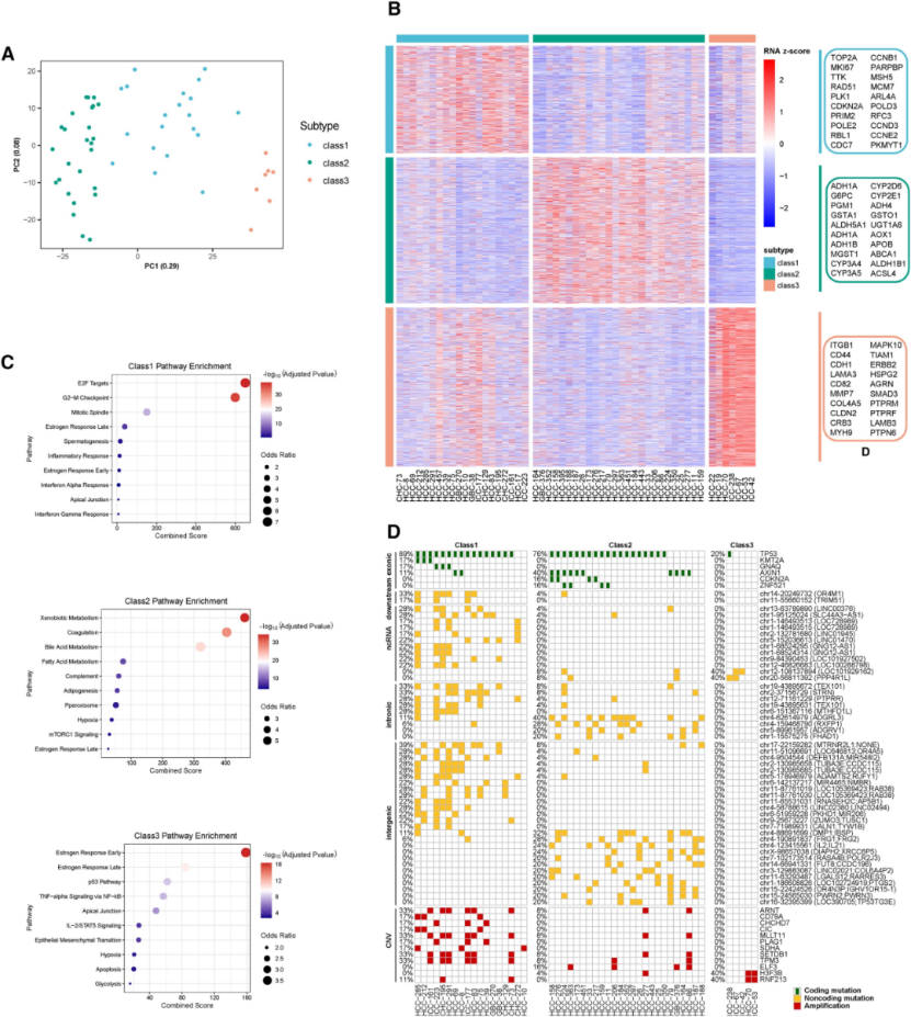 To elucidate transcriptional diversity among PDHOs, researchers performed RNA-seq on the constructed PDHOs. Principal component analysis (PCA) and unsupervised clustering based on the top 2000 most variable genes identified three subgroups within the organoid cohort (Figure 2A). Subgroup 1 was characterized by elevated proliferation-related genes (e.g., TOP2A, MKI-67, CCNB1, CCND3) and exhibited functional enrichment in proliferation-related pathways. Subgroup 2 showed the highest expression levels of metabolism-related genes such as ADH1A, G6PC, CYP3A, and CYP2E1, which regulate metabolic reprogramming, peroxisome function, and hepatic metabolism. Subgroup 3 exhibits specific expression of inflammation- and immunity-related genes (e.g., ITGB1, CD44, CD82, LAMB3, AGRN), primarily regulating cell adhesion and tumor immunity (Figure 2B and 2C). Genomic instability, based on gene mutations and copy number variations (CNVs), showed significant differences across the three subgroups: KMT2A and GNAQ mutations occurred exclusively in Subgroup 1, while AXIN1 mutations were preferentially found in Subgroup 2. Furthermore, mutation burden was generally higher in Subgroup 1 than in other subgroups. Non-coding mutations were widespread across the genome, and based on RNA classification, researchers identified numerous subgroup-specific non-coding mutations. These non-coding mutations may individually act as “mini-drivers” in cancer (Figure 2D).