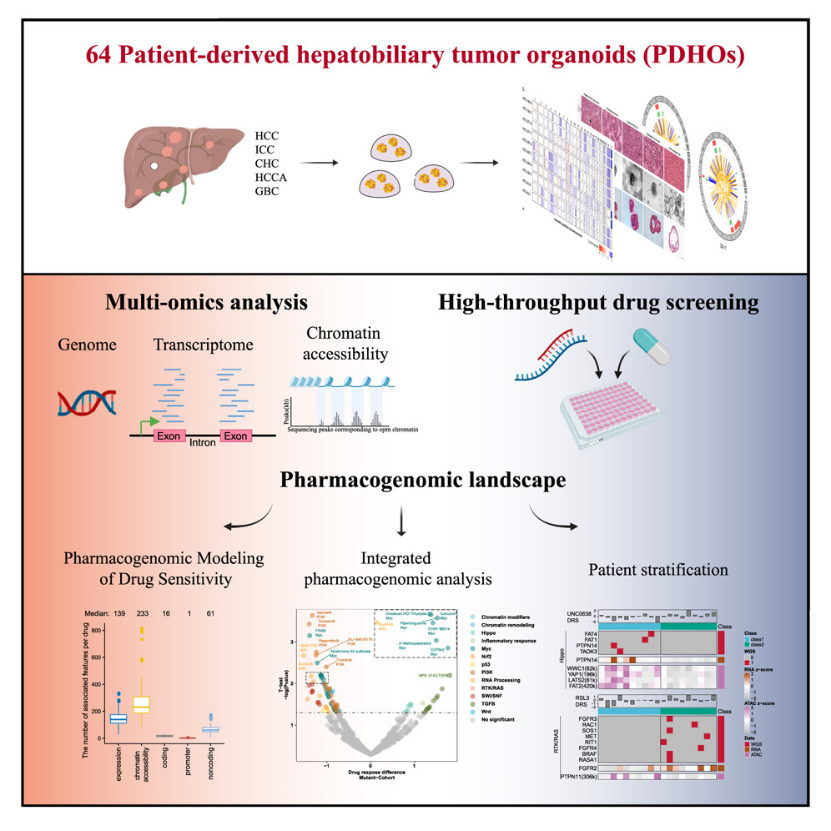 Based on the genetic variation profiles and hereditary characteristics of Chinese liver disease patients, this study independently designed and optimized a scalable organoid culture system for hepatobiliary tumors. It successfully established 64 patient-derived hepatobiliary tumor organoids (PDHOs) models, These organoids were tested for their responses to 265 metabolism- and epigenetics-related chemicals and 36 anticancer drugs. By integrating whole-genome, transcriptome, chromatin accessibility profiles, and drug sensitivity data for 64 clinically relevant drugs, the study defined over 32,000 genomic-drug interactions. Comprehensive multi-omics analysis was performed, encompassing whole-genome sequencing, transcriptome sequencing, ATAC-seq, non-targeted metabolomics. This work establishes a human liver disease organoid multi-omics big data application platform. By further integrating multi-omics sequencing with high-throughput drug screening, it pioneers pharmacogenomics research for hepatobiliary tumors using human tumor organoids.