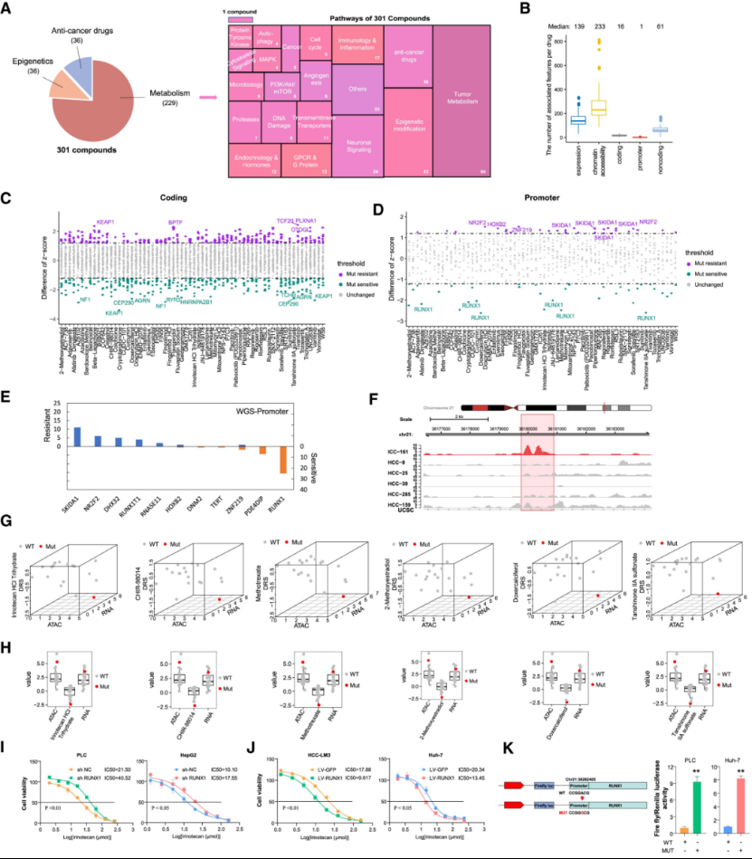 To evaluate PDHO as a functional in vitro disease model, researchers tested whether PDHO could be used for high-throughput drug sensitivity screening. By compiling 301 compounds and using a high dose of 10 μM in the initial screening—covering nearly half of all compounds' maximum inhibitory concentration (IC50) values—they ultimately identified a set of 64 drugs demonstrating 50% inhibition in at least one PDHO model (Figure 4A). By standardizing AUC values of the 64 drugs into Z-scores, researchers identified 1,082 codon mutation-drug pairs, 68 promoter mutation-drug pairs, 3,417 non-coding mutation-drug pairs, 9,573 gene-drug pairs, and 18,191 peak drug pairs (Figure 4B). Researchers found that RUNX1 promoter mutations correlate with drug sensitivity (Fig. 4D and 4E). In this context, chromatin undergoes dramatic repositioning at this site, typically inaccessible (gray dots) but highly accessible in the presence of RUNX1 promoter mutations (Fig. 4F, red dots). A distinct set of drugs exhibits preferential sensitivity in samples harboring RUNX1 promoter mutations (Fig. 4G and 4H). Consistent with findings in hepatobiliary tumor organoids, RUNX1-knockdown cells exhibited increased resistance to irinotecan treatment (Figure 4I). Conversely, exogenous expression of RUNX1 sensitized HCC-LM3 and Huh-7 cells to irinotecan (Figure 4J). To further investigate the potential regulatory role of RUNX1 promoter mutations in drug vulnerability, mutant RUNX1 promoter reporter plasmids were constructed by substituting adenine (A) with guanine (G) within the identified RUNX1 promoter motifs. Dual luciferase assays revealed significantly increased relative luciferase activity in mutant RUNX1 promoters compared to wild-type, confirming the mutation's regulatory effect on RUNX1 promoter activity (Figure 4K). This suggests that enhanced RUNX1 promoter activity may underlie the increased gene expression and preferential drug sensitivity observed in hepatobiliary tumors. These findings reveal genomic features associated with drug sensitivity and provide a potential predictive pharmacogenomic landscape for hepatobiliary tumors.
