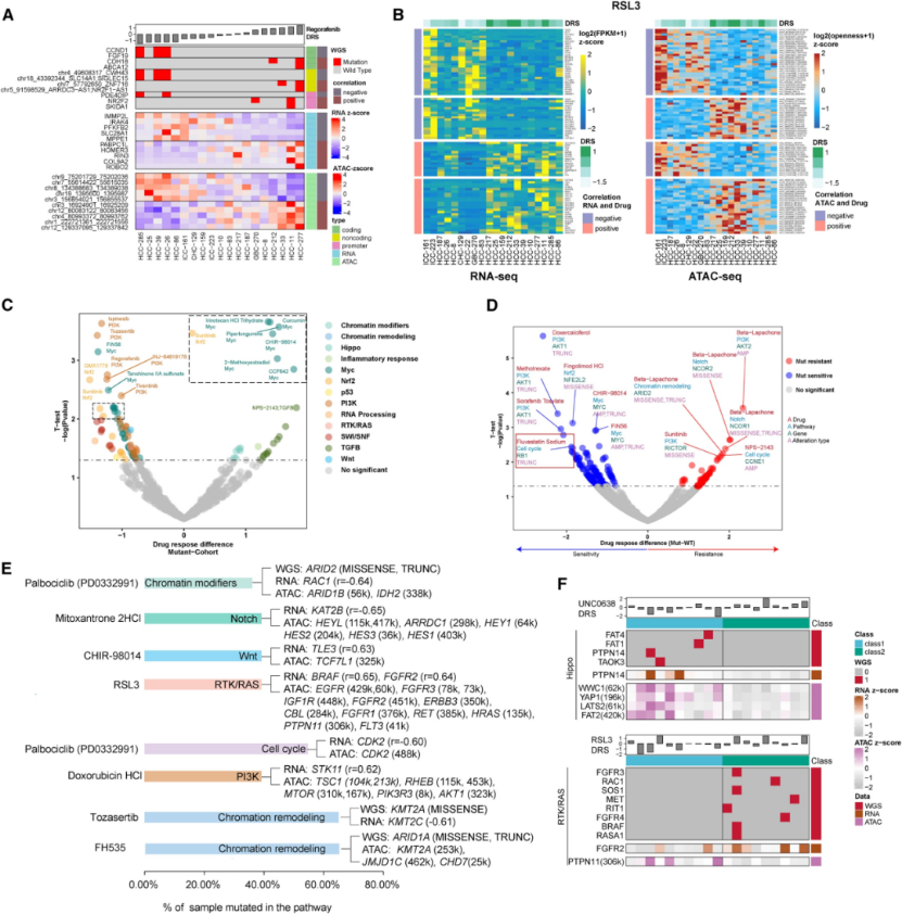 Within single-feature drug associations, researchers identified numerous significant pharmacogenomic relationships. For instance, by identifying PABPC1L expression, they discovered its strong correlation with regorafenib resistance (Figure 5A). Integrated analysis of RNA-seq and ATAC-seq data revealed a set of lipid metabolism-related genes—including SLC30A2, CD74, LCN2, and AGXT—that mediate functional accessibility of non-coding DNA regulatory elements and may predict sensitivity to the ferroptosis activator RSL3 (Figure 5B). By examining key mutations prioritizing altered drug vulnerability in signaling pathways (Figure 5D), a truncating mutation in the tumor suppressor gene RB1 within the cell cycle pathway was associated with sensitivity to the lipid peroxidation inhibitor fluvastatin sodium (Figure 5D). To investigate the predictive power of different molecular data combinations for drug response, researchers established random combination models of WGS, RNA-seq, and ATAC-seq for drug sensitivity. For each drug, the optimal combination of data types and corresponding models—termed “reference models”—was identified to classify patients based on potential therapies (Figure 5E). For example, Aurora kinase inhibitors showed associations with chromatin remodeling signaling, characterized by KMT2A missense mutations and KMT2C expression (Figure 5E). Furthermore, using combinatorial models, the authors investigated subgroup-specific pharmacology and personalized treatment strategies for hepatobiliary tumors based on RNA-based classification. Subgroup 1 exhibits significant disruption of the Hippo pathway at genomic, transcriptomic, and epigenetic levels. Subgroup 2 tends to show resistance to RSL3 and exhibits distinct activity in RTK/RAS signaling aberrations (Figure 5F). This “reference model” may serve as an effective means for stratifying patients for different cancer treatments in the near term.
