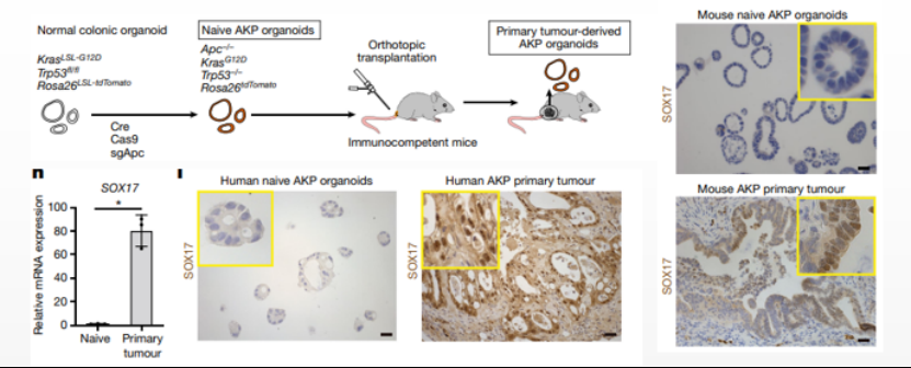 First, the authors transplanted colorectal cancer organoids into mouse colons to simulate the progression of colorectal cancer from early to advanced stages in vivo. This enabled analysis of transcriptional and epigenetic changes during cancer evolution. The results revealed that the colonic environment in mice induces stable, heritable transcriptional and epigenetic alterations in colorectal cancer organoids. Concurrently, a significant upregulation of the SOX17 transcription factor was observed. Consequently, the authors concluded that transplanting colorectal cancer organoids into the colonic environment of mice leads to upregulation of the SOX17 transcription factor.