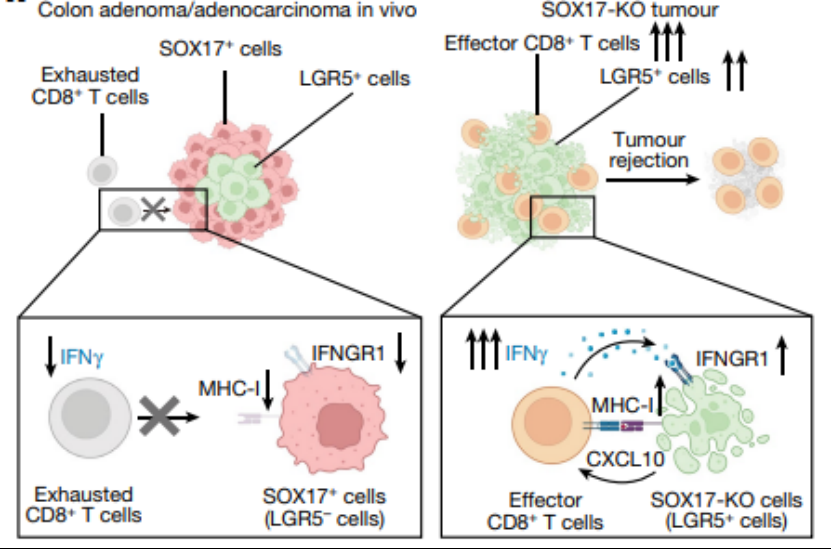 Through the above studies, the authors revealed that the SOX17 transcription factor promotes LGR5-stem cell differentiation by reprogramming tumor cell epigenetics. It inhibits tumor cells' perception and response to IFN-γ, thereby preventing anti-tumor T cells from immunologically clearing tumor cells. This creates an early tumor-suppressive microenvironment particularly conducive to colorectal cancer formation, enabling its smooth development and rapid progression. In summary, SOX17 enables cancer progression by suppressing IFN-γ perception and promoting adaptive immune evasion.