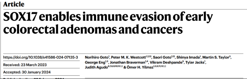 Recently, the research group led by Ömer H. Yilmaz collaborated with Judith Agudo's group to publish a research paper titled “SOX17 enables immune evasion of early colorectal adenomas and cancers” in Nature. In this study, the authors comprehensively analyzed epigenetic and transcriptomic changes during colorectal cancer progression using an in vivo transplantation model of colorectal cancer organoids. They identified a key factor, SOX17, that promotes tumor immune evasion. In colorectal cancer organoids, the transcription factor SOX17 is induced, promoting tumor cell differentiation into a phenotype that evades immune recognition. This process suppresses tumor cells' responsiveness to IFN-γ, reduces the infiltration of effector CD8+ T cells, and consequently establishes an immunosuppressive tumor microenvironment. This mechanism drives the formation and progression of early-stage colorectal tumors.