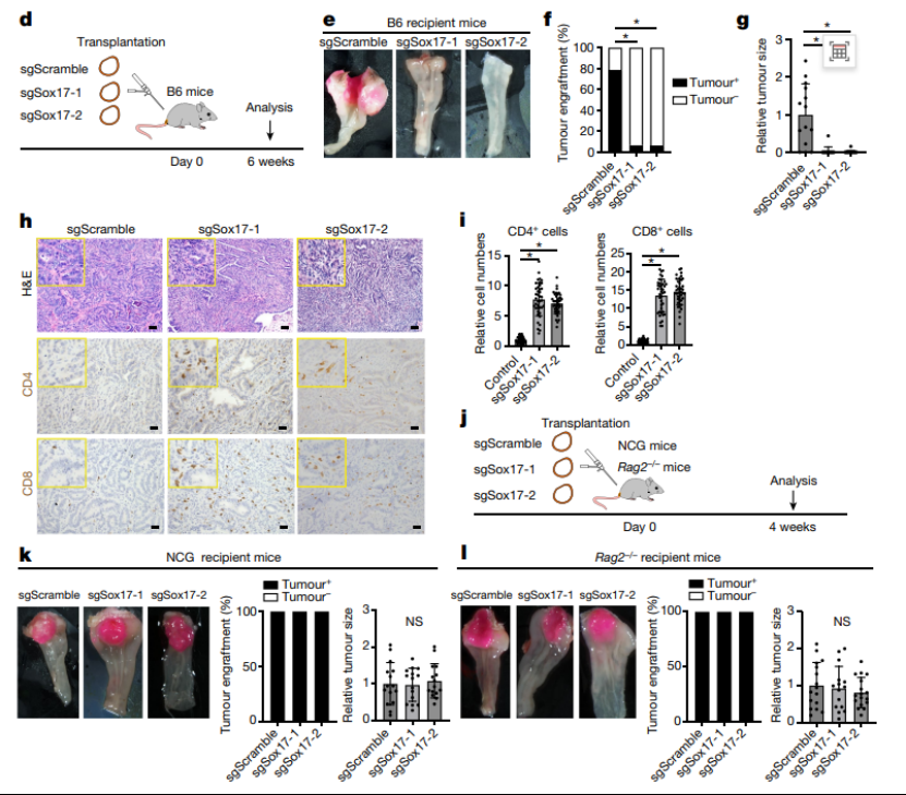 Next, the authors investigated the role of the SOX17 transcription factor in colorectal cancer progression. Using CRISPR-Cas9 technology, they generated SOX17 knockout colorectal cancer organoids and transplanted them into mice. Results showed that only 6% of transplanted mice developed tumors in the absence of SOX17, with significantly smaller tumor volumes compared to the control group. Furthermore, SOX17 deficiency induced enhanced immune infiltration in tumors, severely inhibiting their growth. In contrast, mice transplanted with normal colorectal cancer organoids exhibited the opposite immune infiltration phenotype. In immunodeficient mice, however, knocking out SOX17 had no effect on tumor growth. Combining these three sets of results, the authors conclude that the SOX17 transcription factor promotes tumor progression in vivo by inhibiting immune infiltration.
