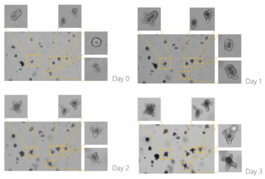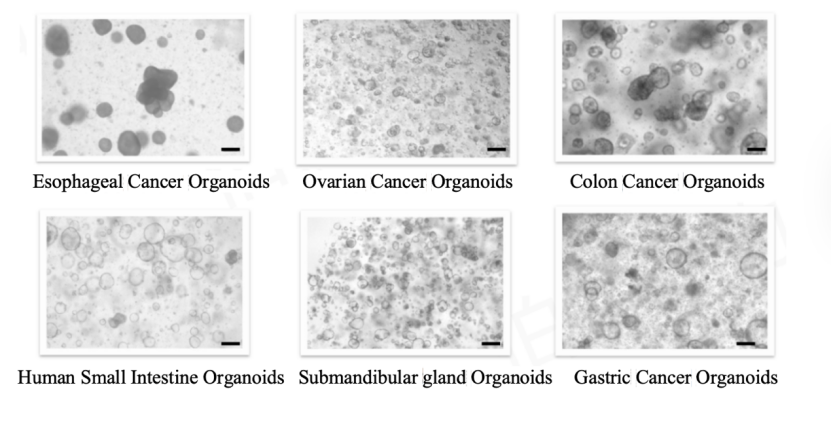The following images show organoid cultures derived from cell clusters obtained by processing various tissue types through the intelligent tissue dissociation system: