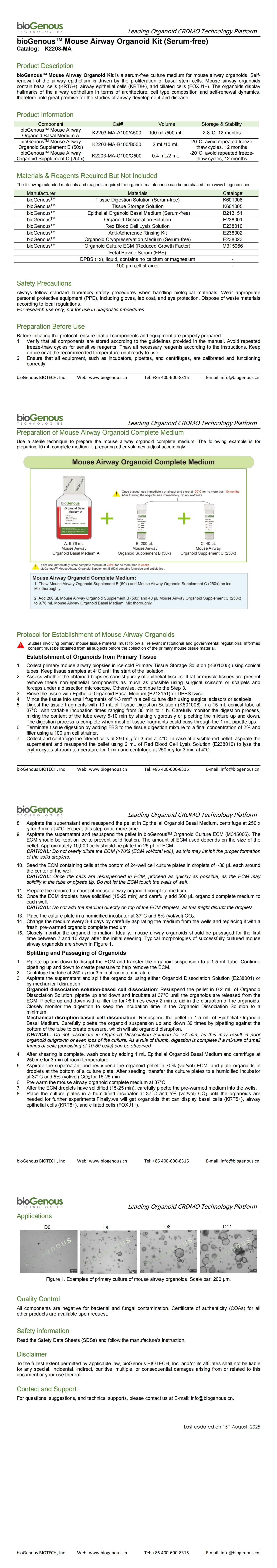 bioGenous TM Mouse Airway Organoid Kit is a serum-free cell culture medium for the establishment and maintenance of mouse airway organoids derived from mouse airway stem cells. Self-renewal of the airway epithelium is driven by the proliferation of basal stem cells. Mouse Airway Organoids contain basal cells, ciliated cells, secretory cells, and a few number of neuroendocrine cells, thus the organoids display all hallmarks of the airway epithelium in terms of architecture, cell type composition and self-renewal dynamics, therefore hold great promise for the studies of airway development and disease.